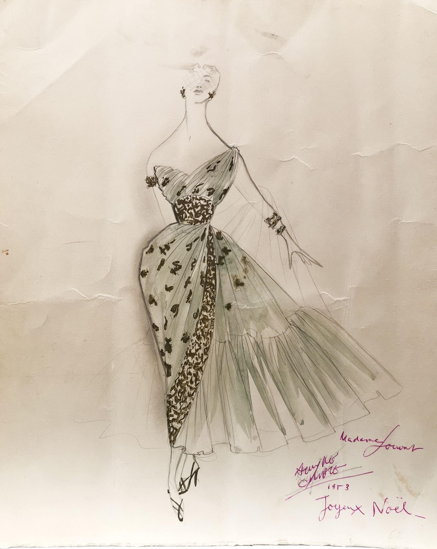 Croquis de mode, mine de plomb et aquarelle sur papier, signée, dédicacée à Mme Louvat et datée 1953, 33x25 cm