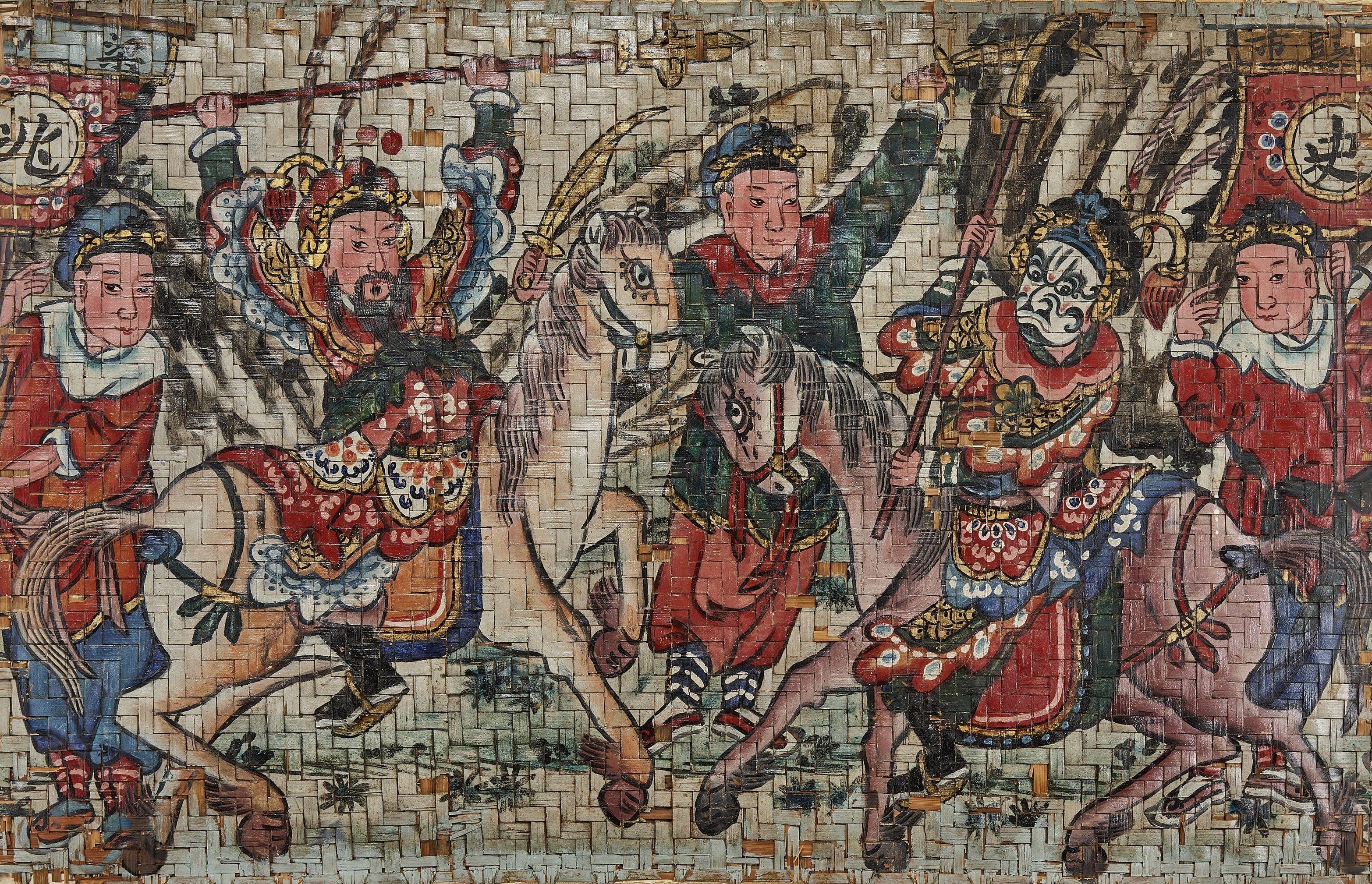 Tissage asiatique, défilé des chevaliers, huile sur bambou, tissée, 74x116 cm
