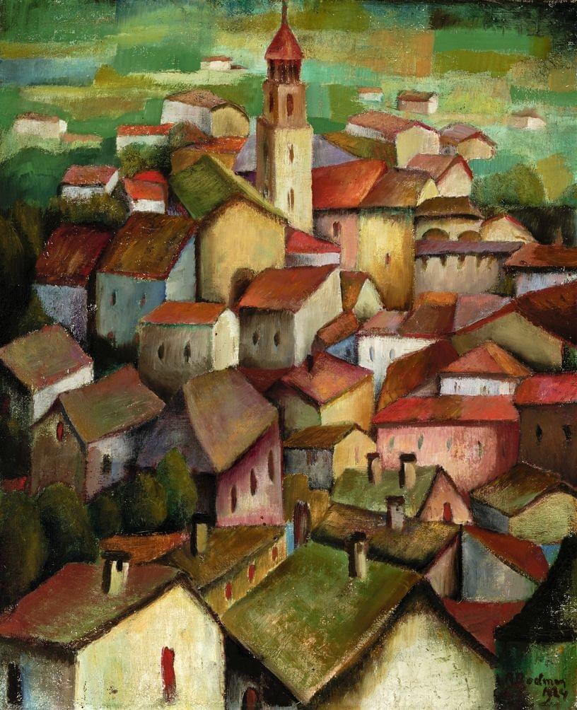Village, huile sur toile, signée et datée 1924, 56x45 cm. Provenance: Château fribourgeois