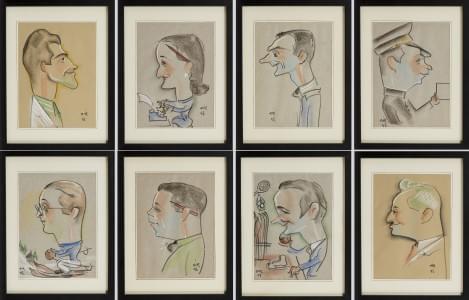 Série de huit caricatures, aquarelle et gouache sur papier, circa 1930, 30x22 cm