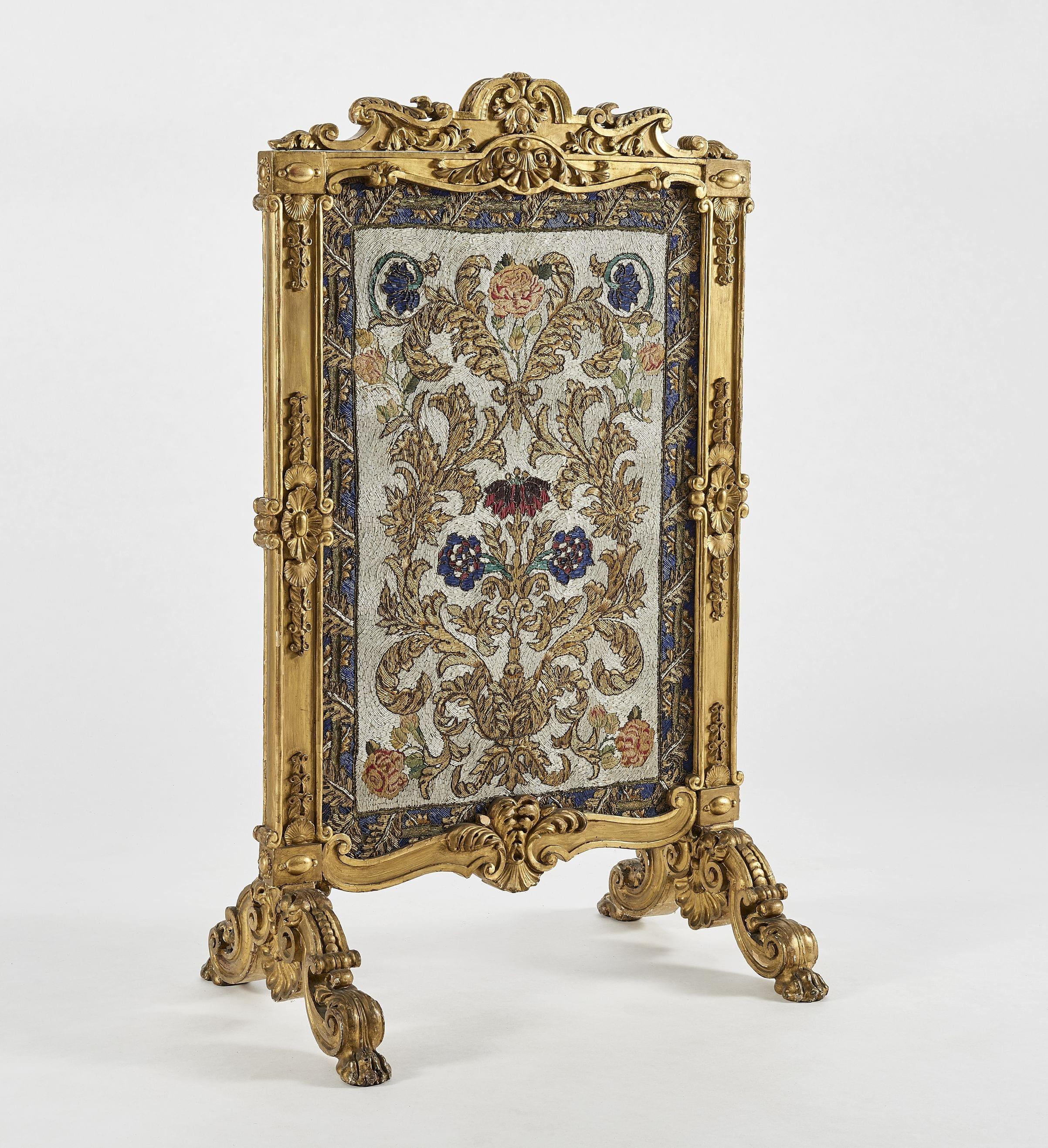 Bois sculpté et doré, broderie de perles et soie à motifs d'acanthes, 115x68 cm. Provenance: collection Pernet-Villaverde