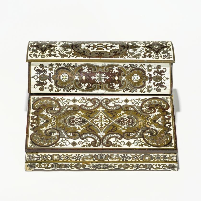 A riche décor marqueté de laiton, palissandre, ivoire, étain et nacre, 21x40x33 cm