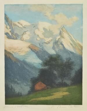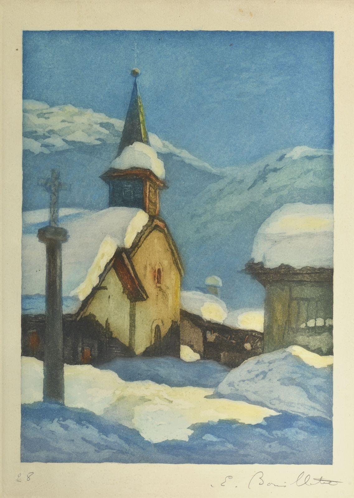 Mayens et chapelle sous la neige, paire d'estampes couleur signées à la mine de plomb, l'une épreuve d'artiste et l'autre numérotée 28, 28x22 cm