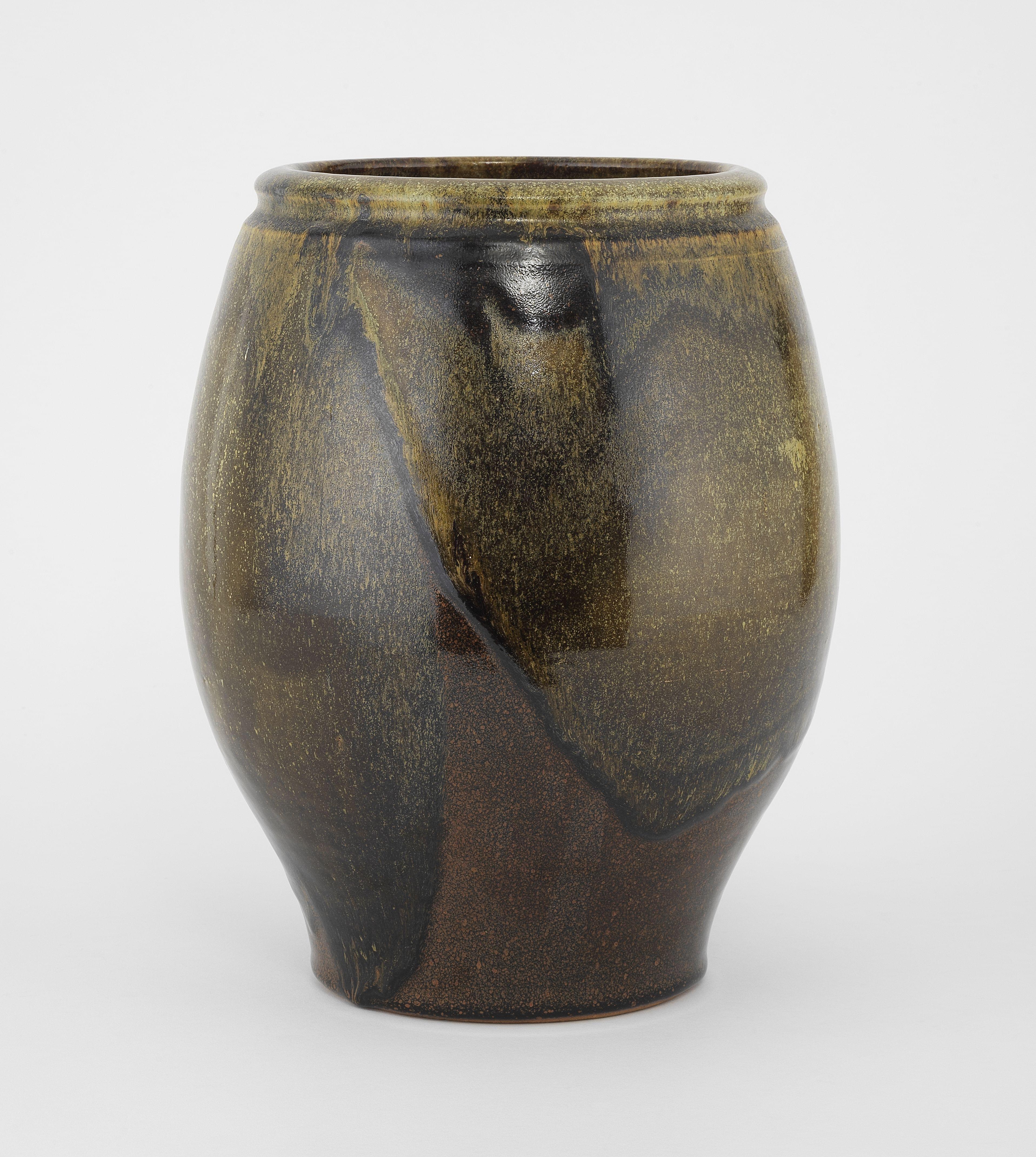 Deux vases, grès émaillé beige et aubergine, signés, H 8 et 18 c...
