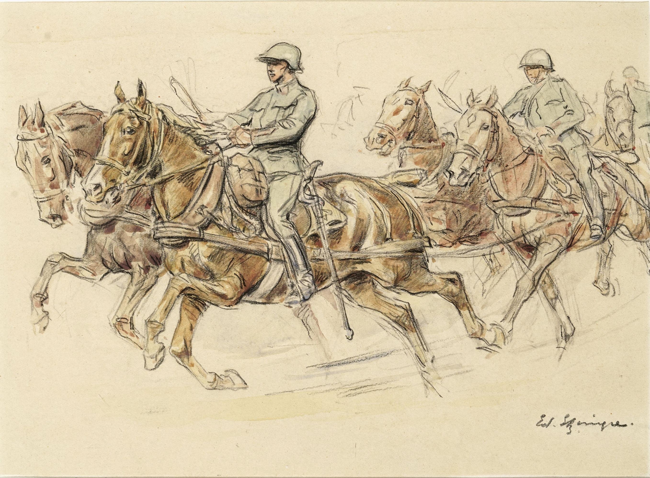 Deux militaires, fusain et aquarelle, signés, 22x22 cm