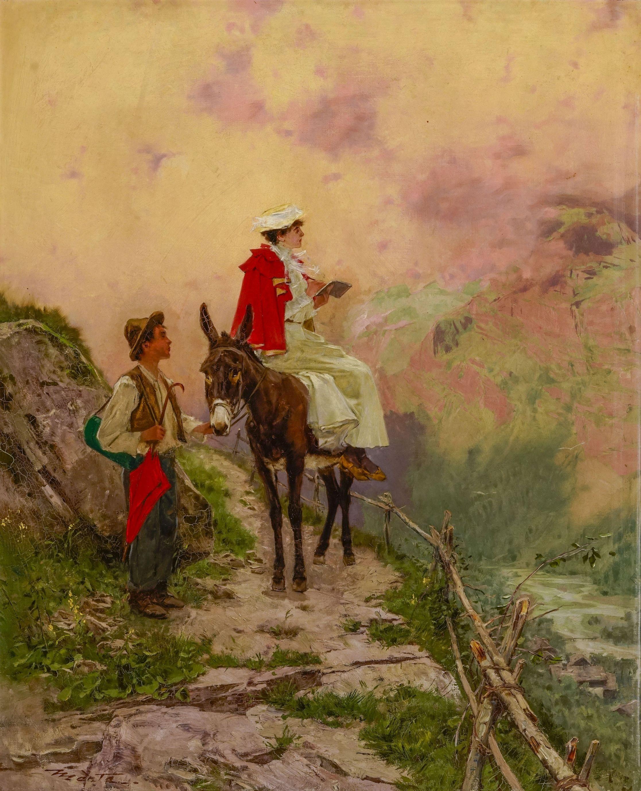 Paysannes et militaire, huile sur toile, signée, 70x99 cm