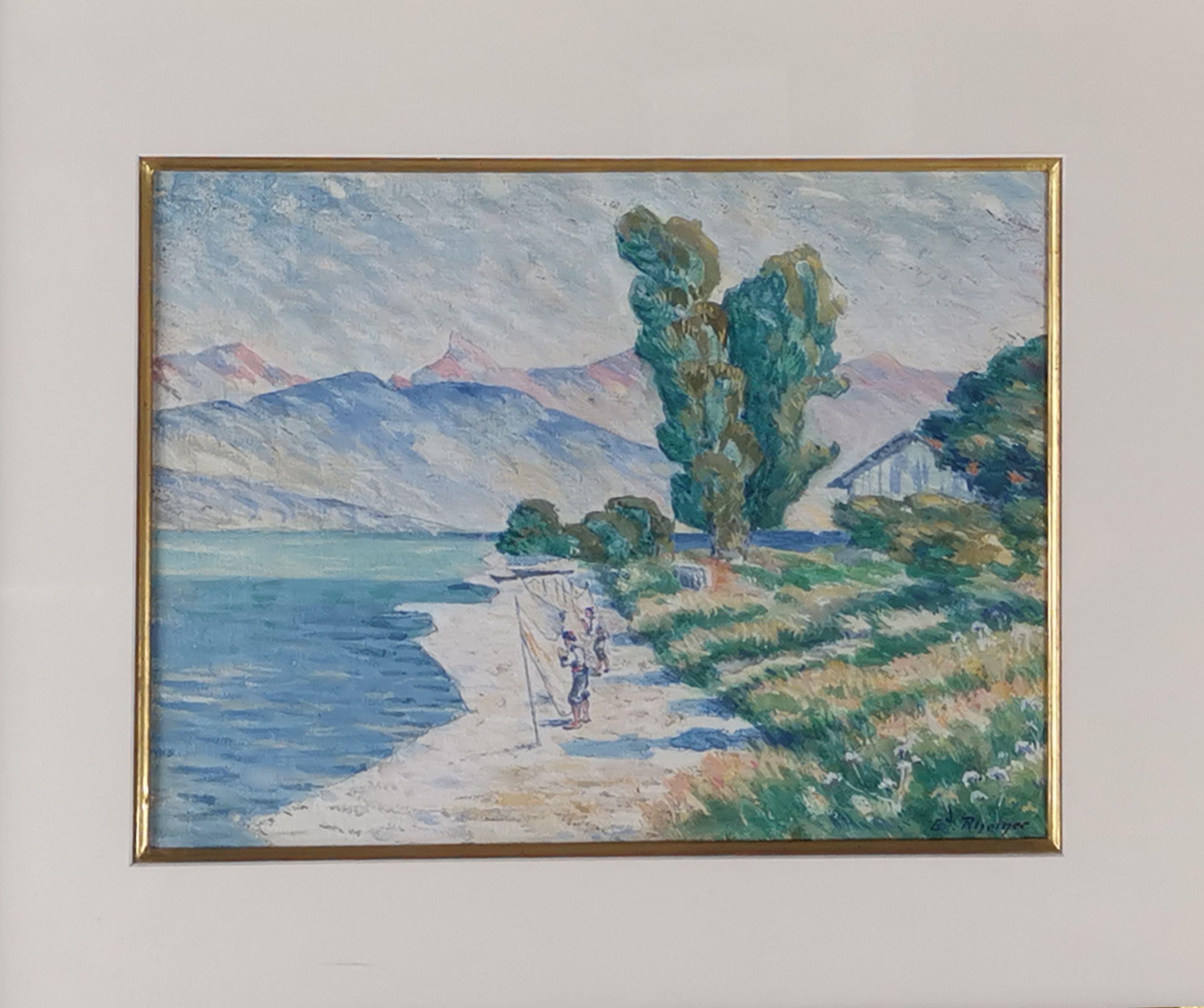 Lumière du couchant sur les rives, huile sur panneau, signée, 37...