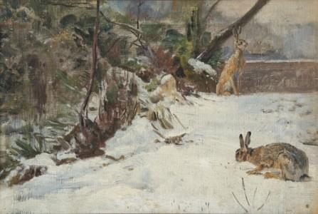 Lapins sous la neige, huile sur carton, signée, dédicacée au dos...