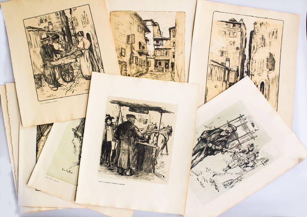 Deux chevaux harnachés et un militaire, crayons de couleur et mi...