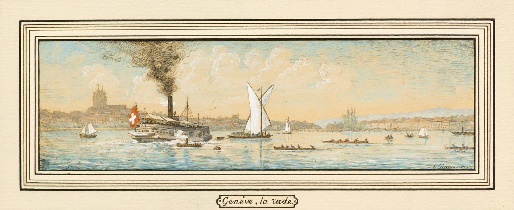 La rade de Genève, encre aquarellée sur papier signée, 7x23 cm