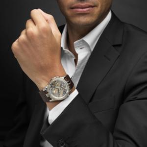 Cadran squelette ciselé, aiguilles bleuies, édition très limitée et numérotée 8/10, acier et or 750, D 45 mm, dans son écrin