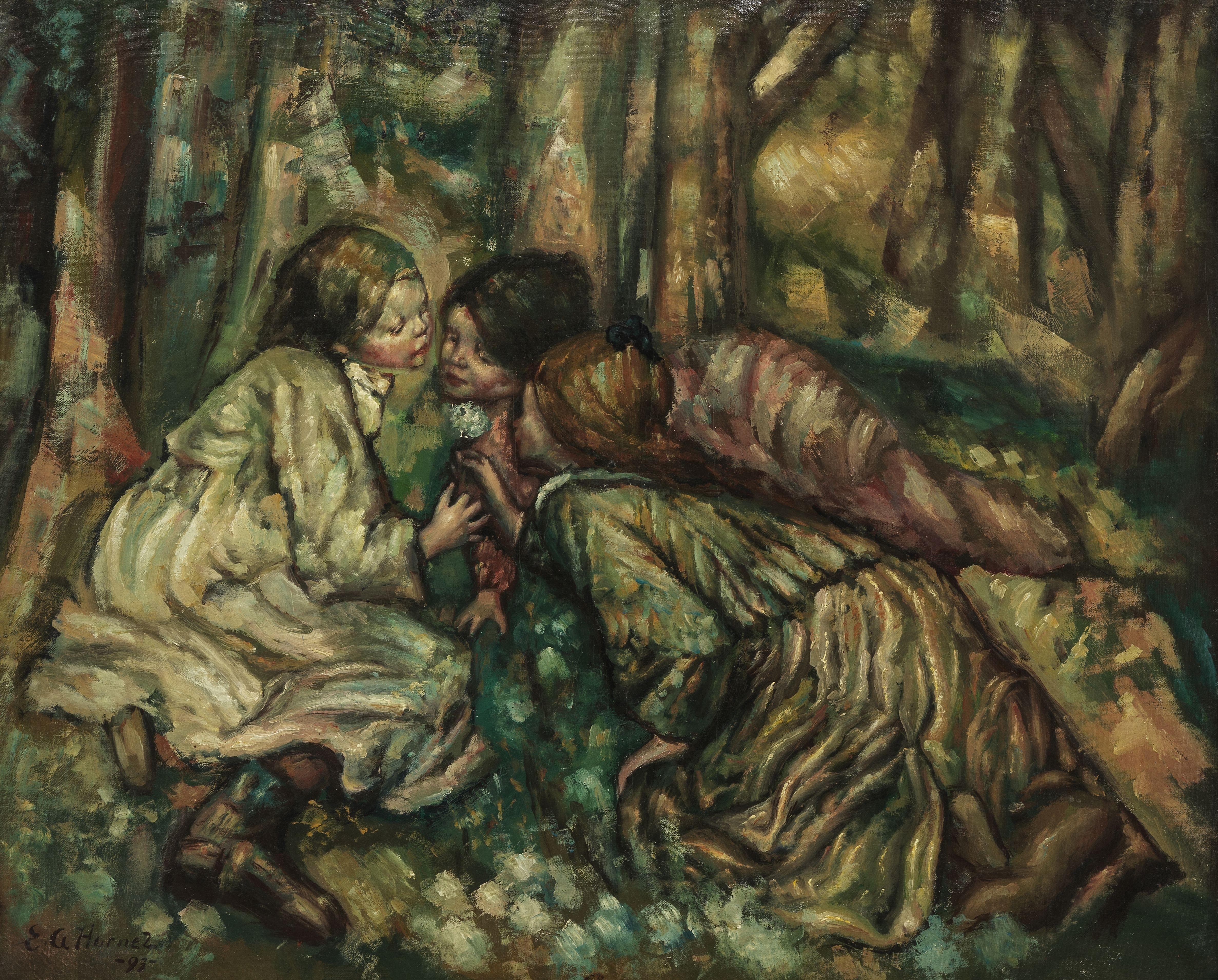 La conversation, huile sur toile, signée et datée 93, 79x63 cm.