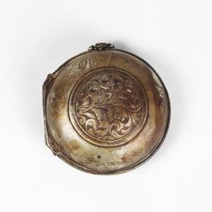 Cadran émaillé blanc, aiguilles en argent, chiffres noirs, milieu XVIIIe s, argent, D env. 60 mm, dans un grand boîtier fermé à décor de feuilles d'acanthes. Provenance: Collection en Suisse d'une famille franco-italienne.