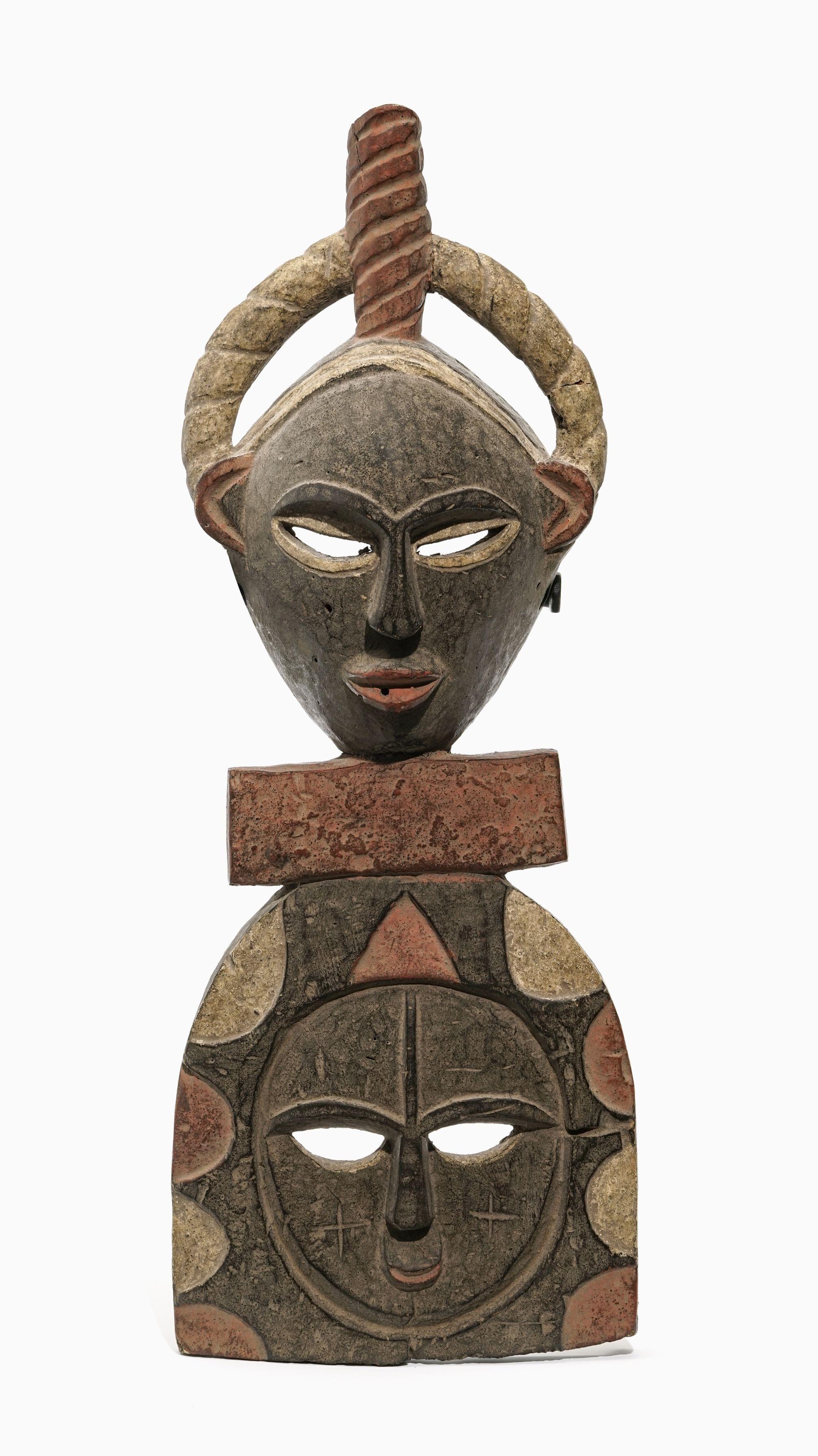 1068. Eket (Nigéria), double masque - Culture des grasslands (Nigéria), Corne à boire sculptée - Mambila (Nigéria) statuette de serpent rituel au visage anthropomorphe
