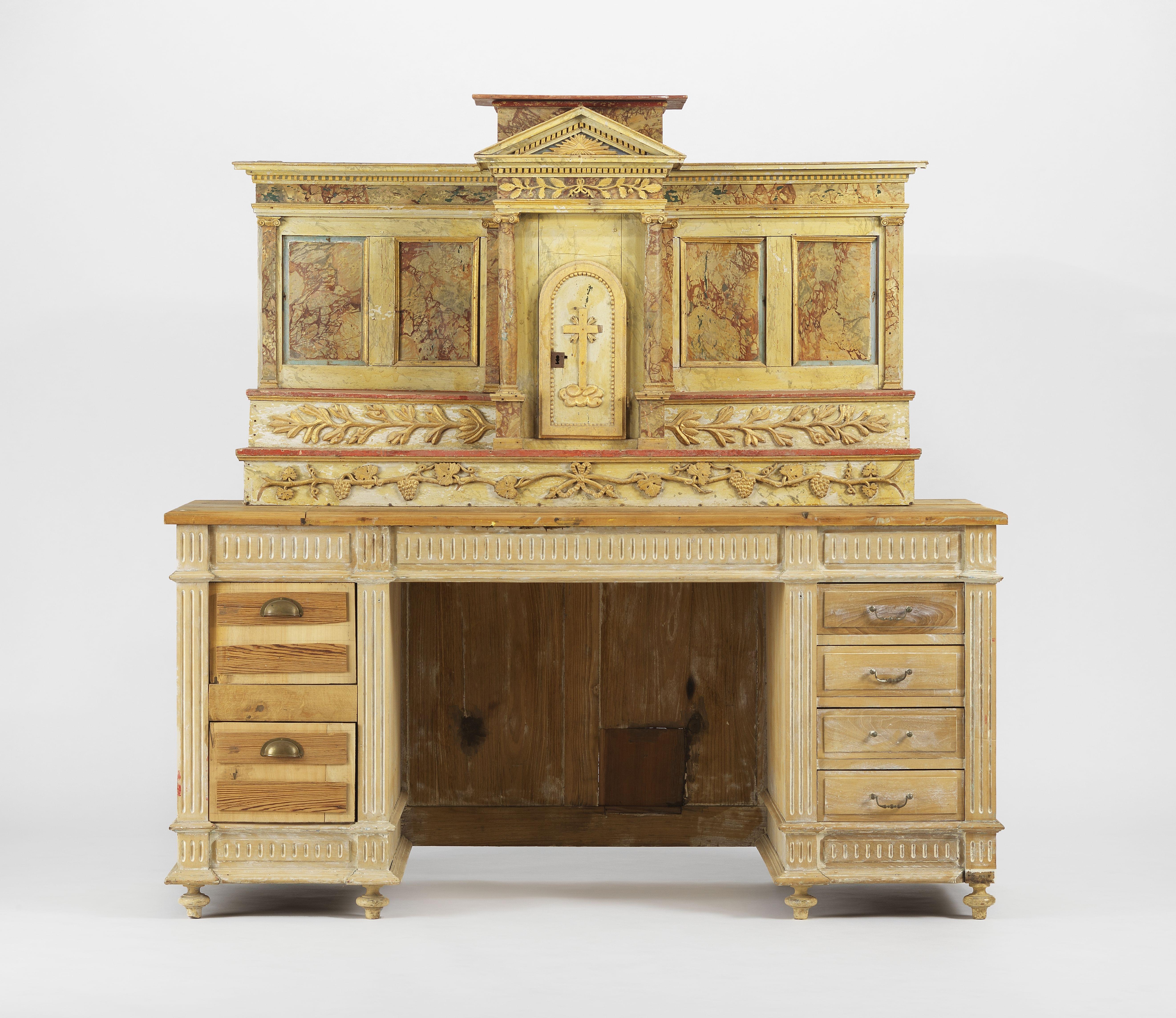 Monté sur un bureau postérieur, bois mouluré et peint, dim. autel: 92x157x40 cm, dim. bureau: 86x178x70 cm
