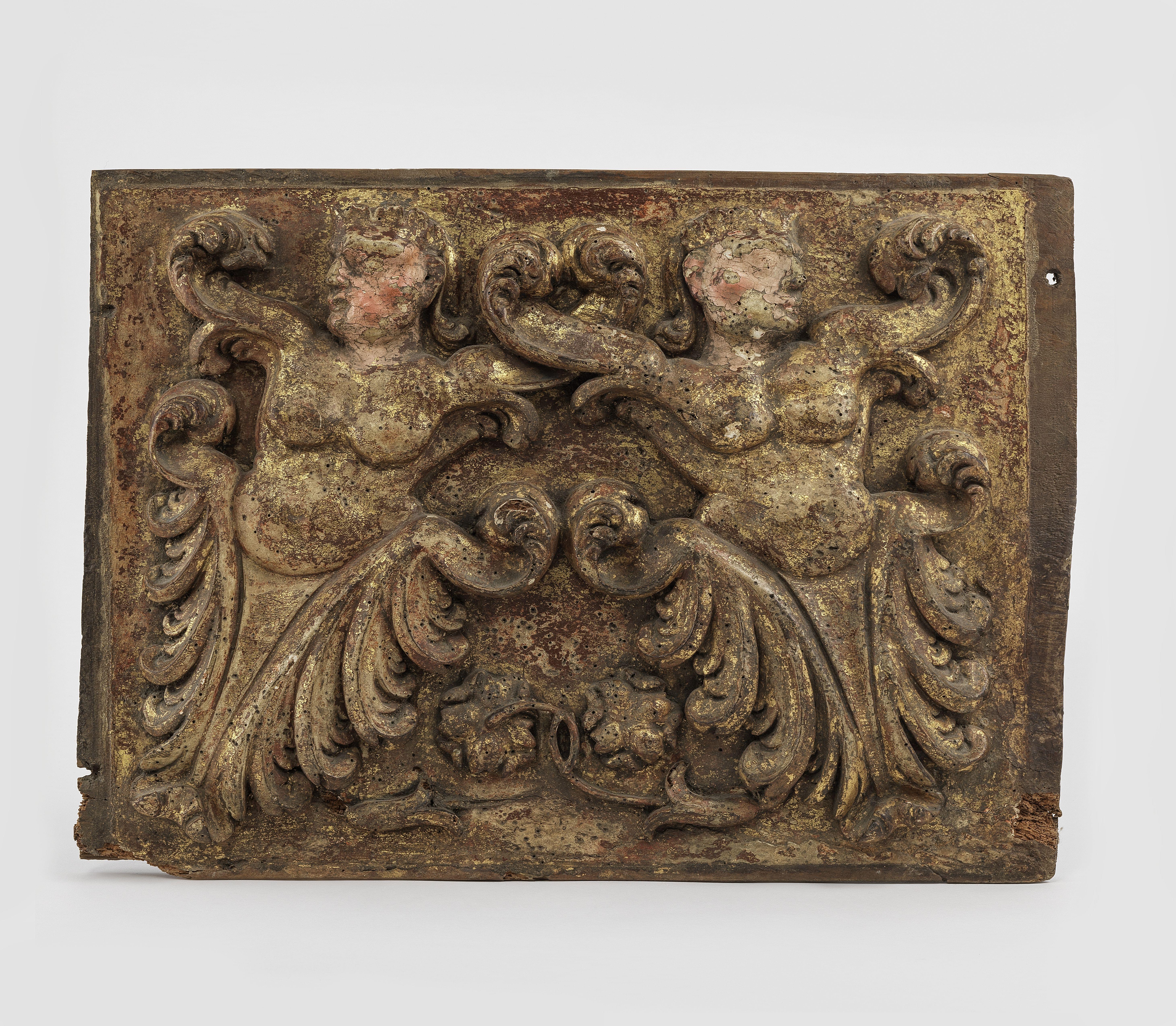 Bois sculpté en bas-relief, doré et polychrome, à motif de deux personnages terminés en feuilles, 34x47 cm