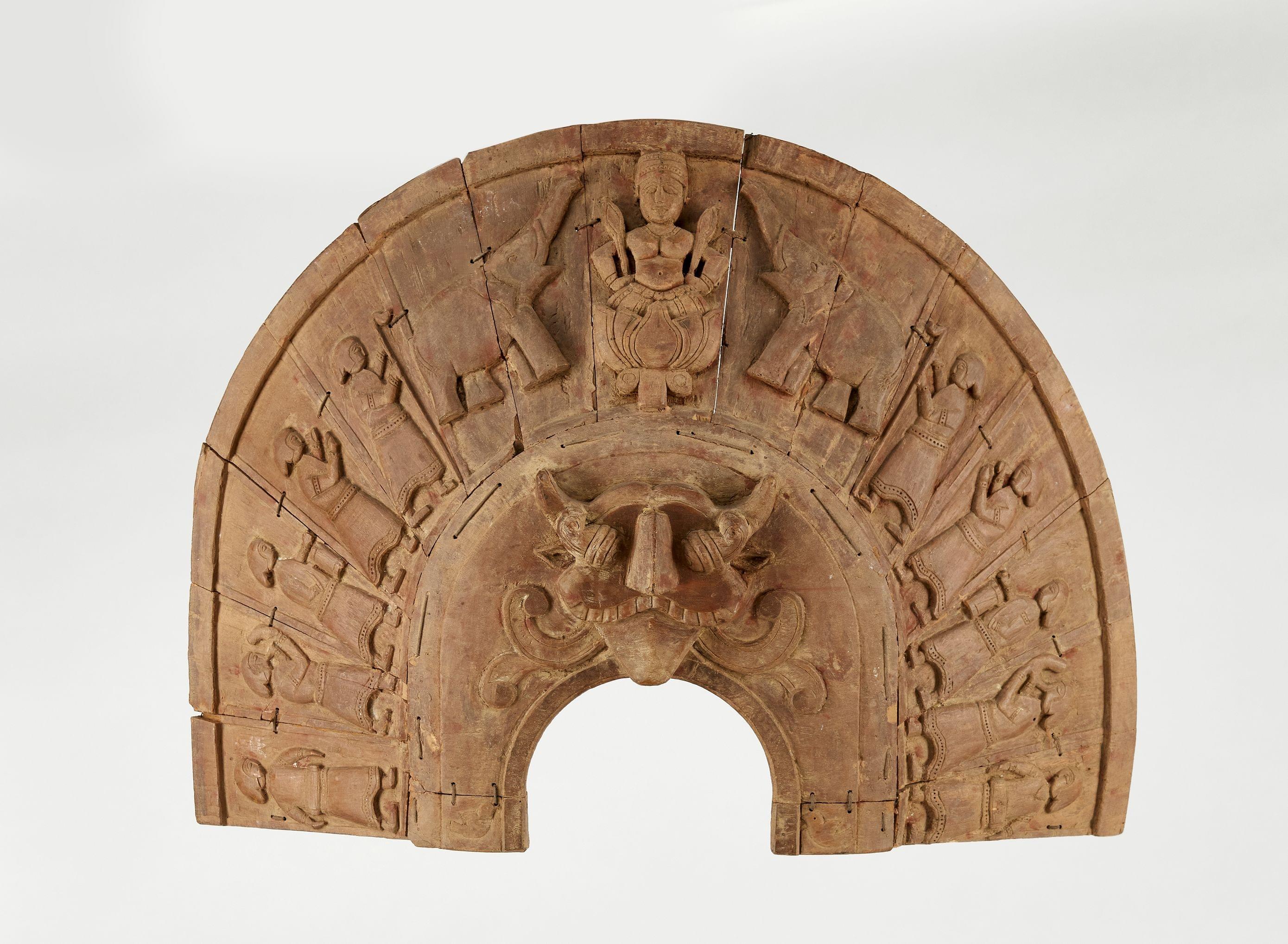 Bois sculpté à décor de personnages, éléphants, divinités et dragons, 65x85 cm
