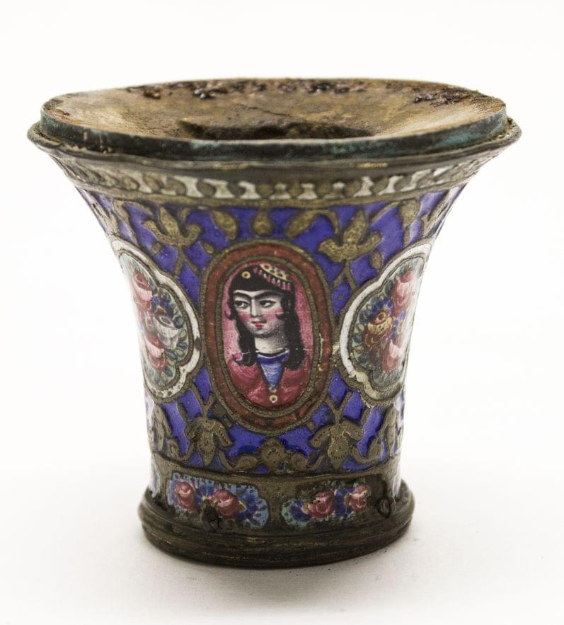 Cuivre émaillé à décor de fleurs et personnages féminins, Iran, époque Qajar, XIXe s, H 7 cm (ghalian cup)