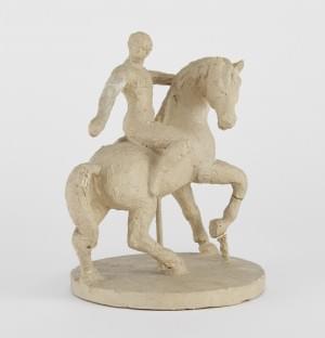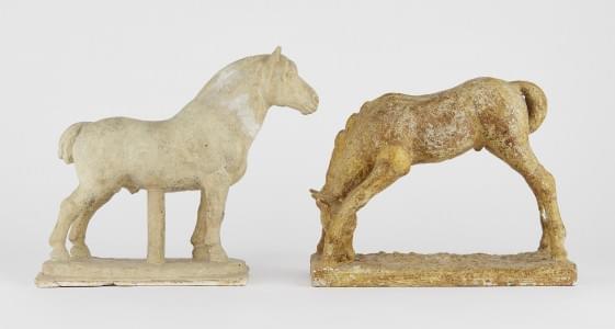 Cheval de trait et poulain, deux plâtres, signés, H 22 et 26 cm
