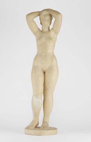 Jeune femme les bras relevés, plâtre, signé, H 76 cm