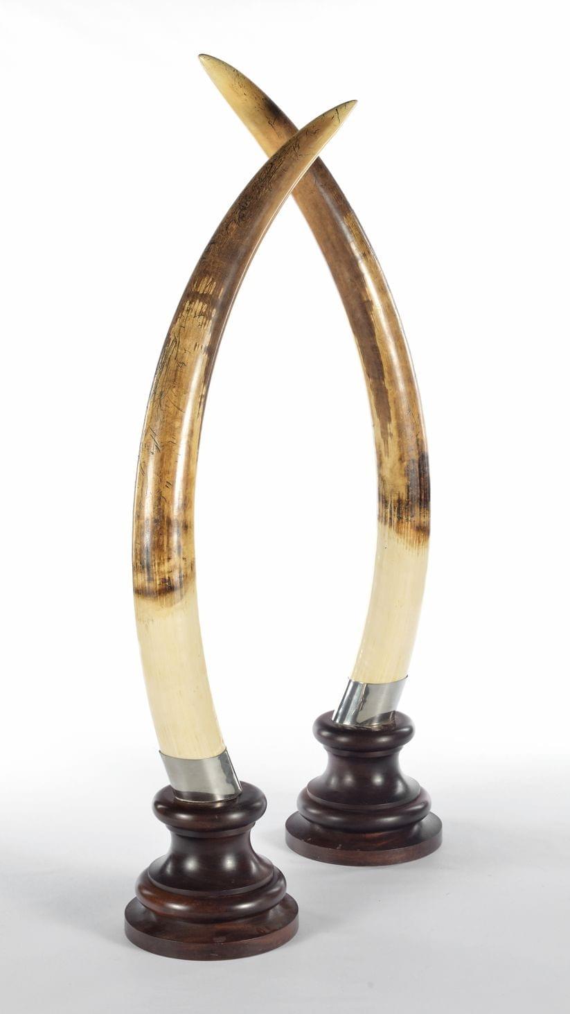 Paire de défenses, monture en métal chromé, socle en bois, Longueur, 145 cm env, poids, env. 42 kg