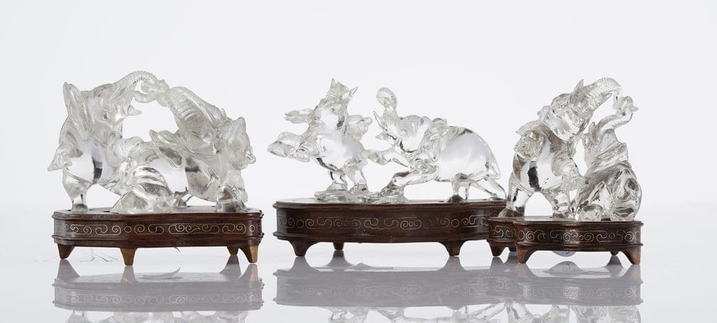 Trois groupes en cristal de roche sculpté, H 7 et 6 cm