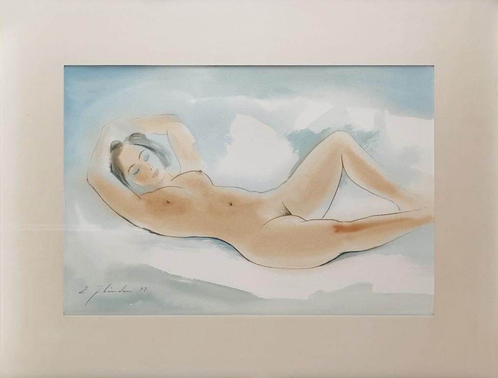 Vue du lac, aquarelle sur papier, signée et datée 1977, 33x47 cm