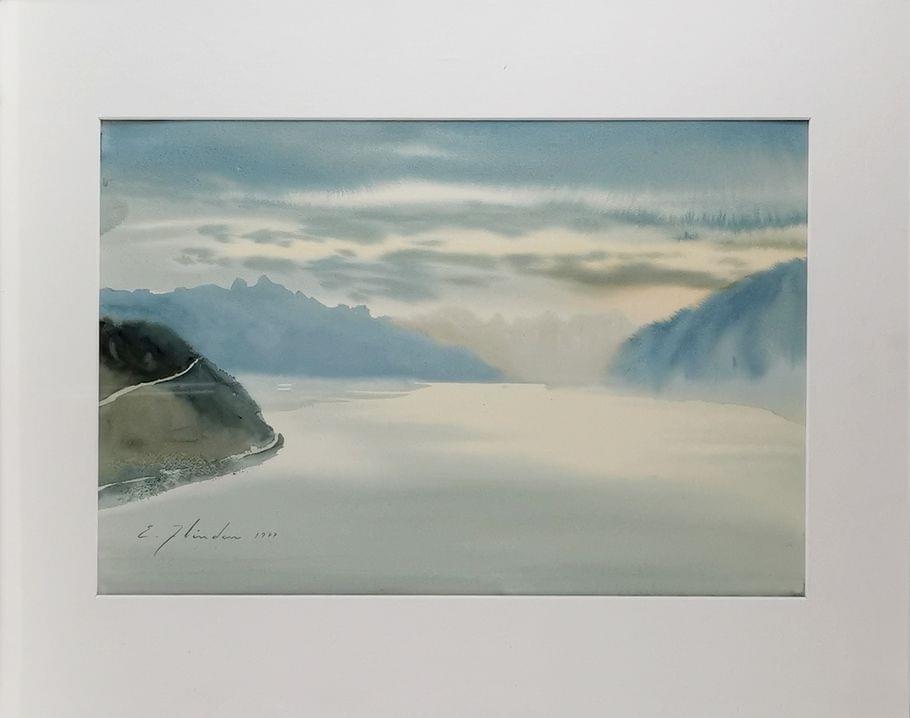 Vue du lac Léman, aquarelle sur papier, signée et datée 2001, 33...