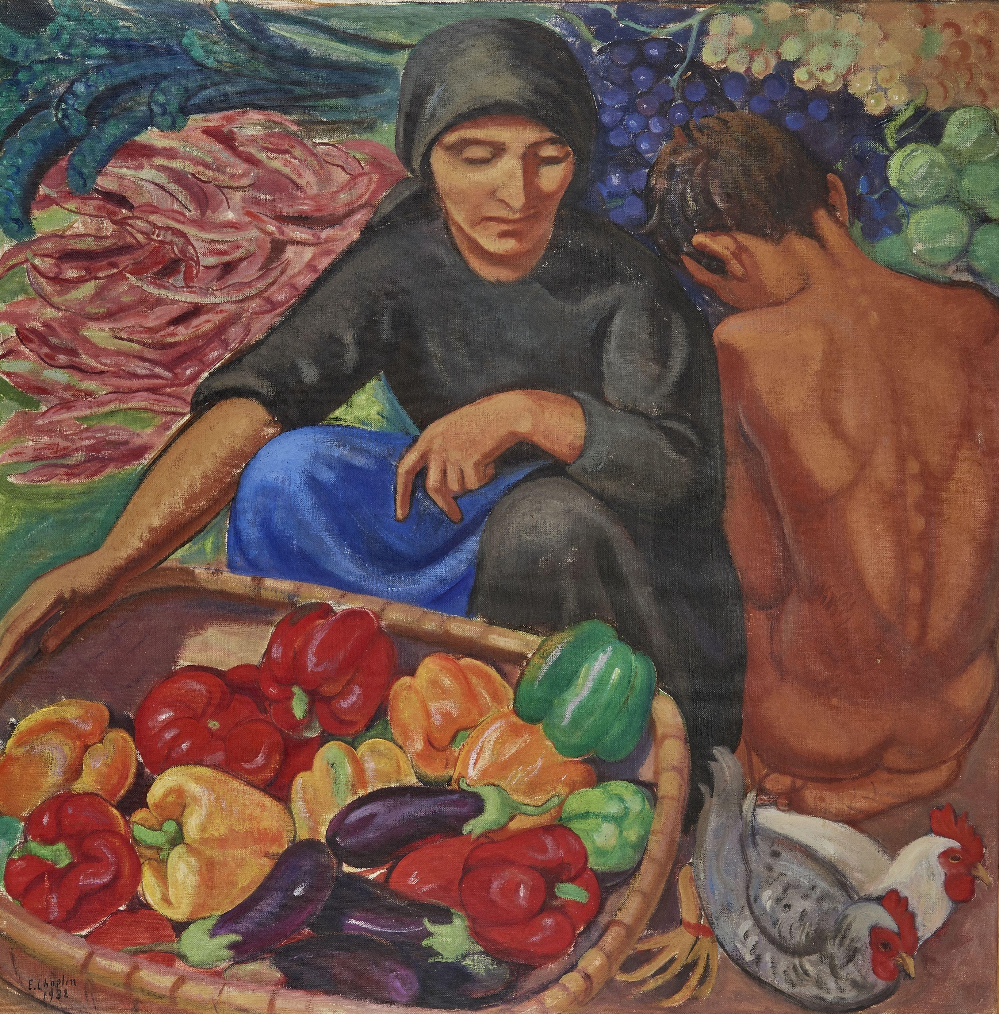 Au marché, huile sur toile, signée et datée 1932, 95x95 cm