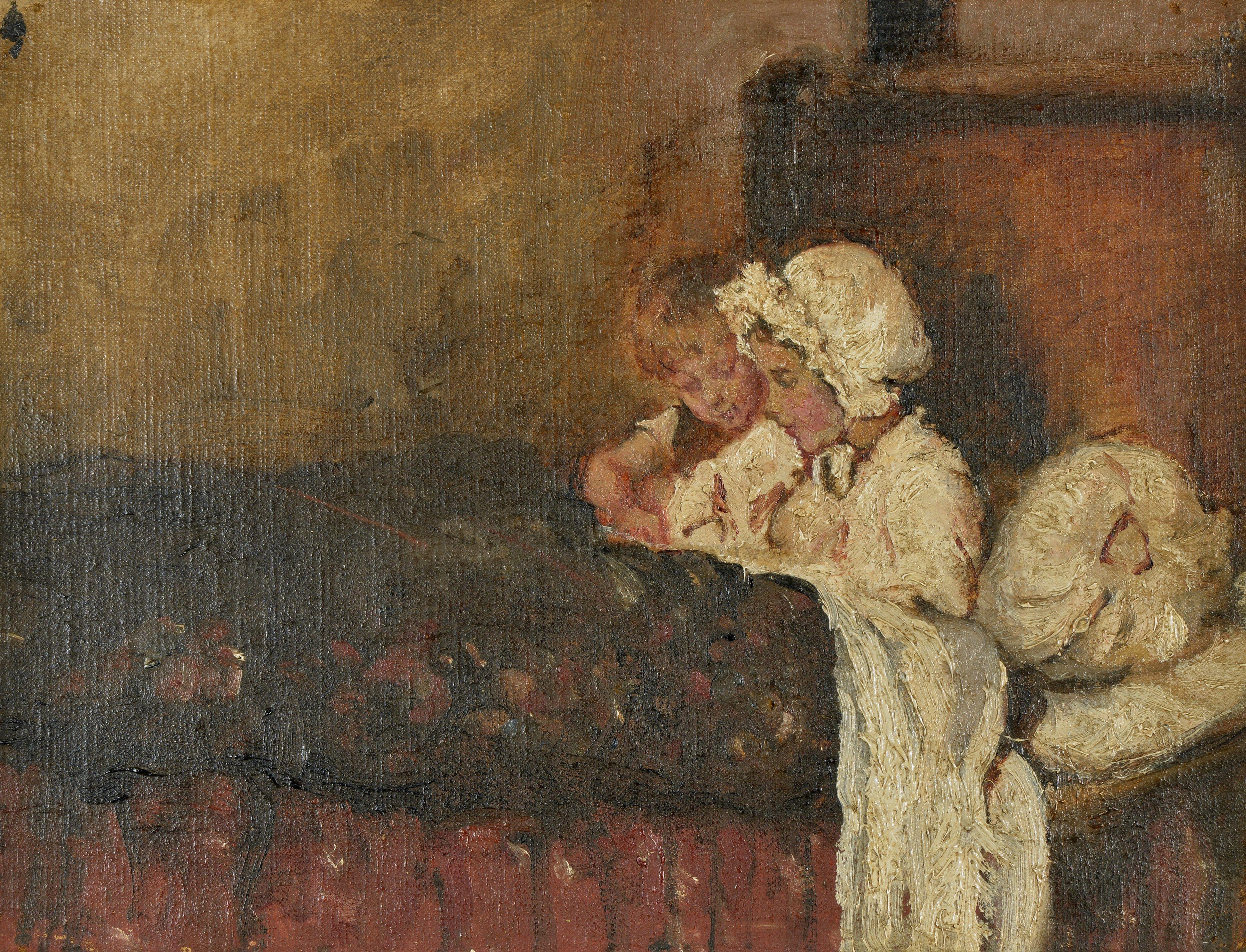 Mère et enfants, huile sur toile, signée en bas à droites; 35x27...