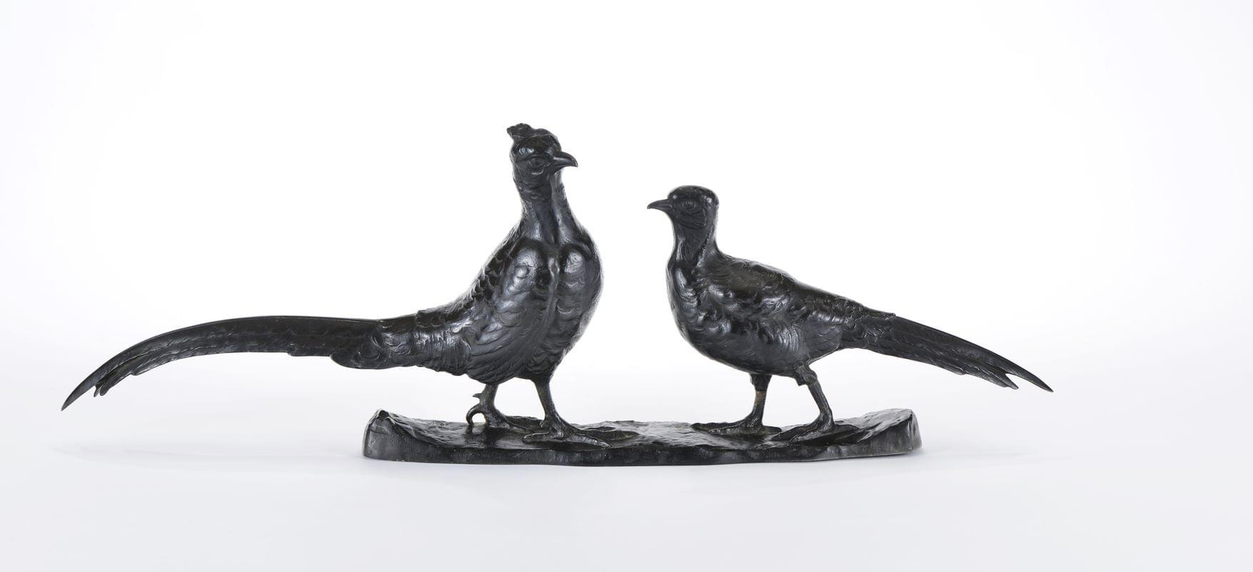 Couple de faisans, bronze à patine brune, signé avec cachet du fondeur, L 75 cm