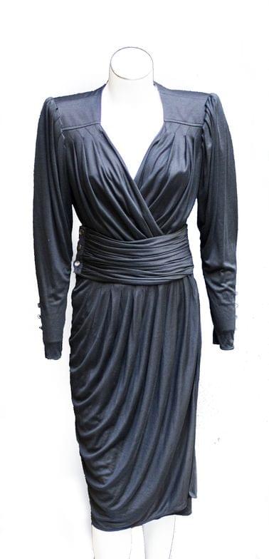 Robe noir cache-cœur en viscose et polyester avec une ceinture amovible du même tissu, T12