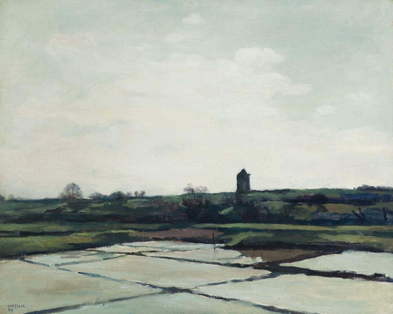 La vache et le moulin, huile sur toile, signée et datée 18,