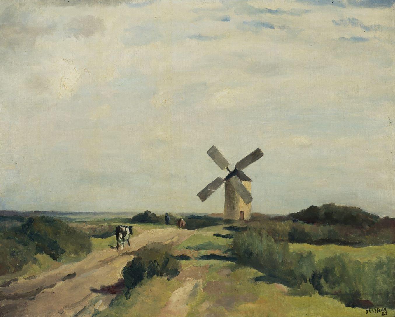 La paysanne et le moulin, huile sur toile, signée, 50x60 cm