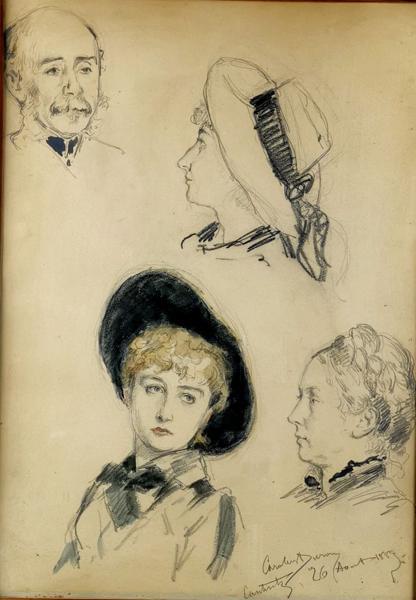Etudes de têtes de femmes, mine de plomb et fusain, signé et dat...