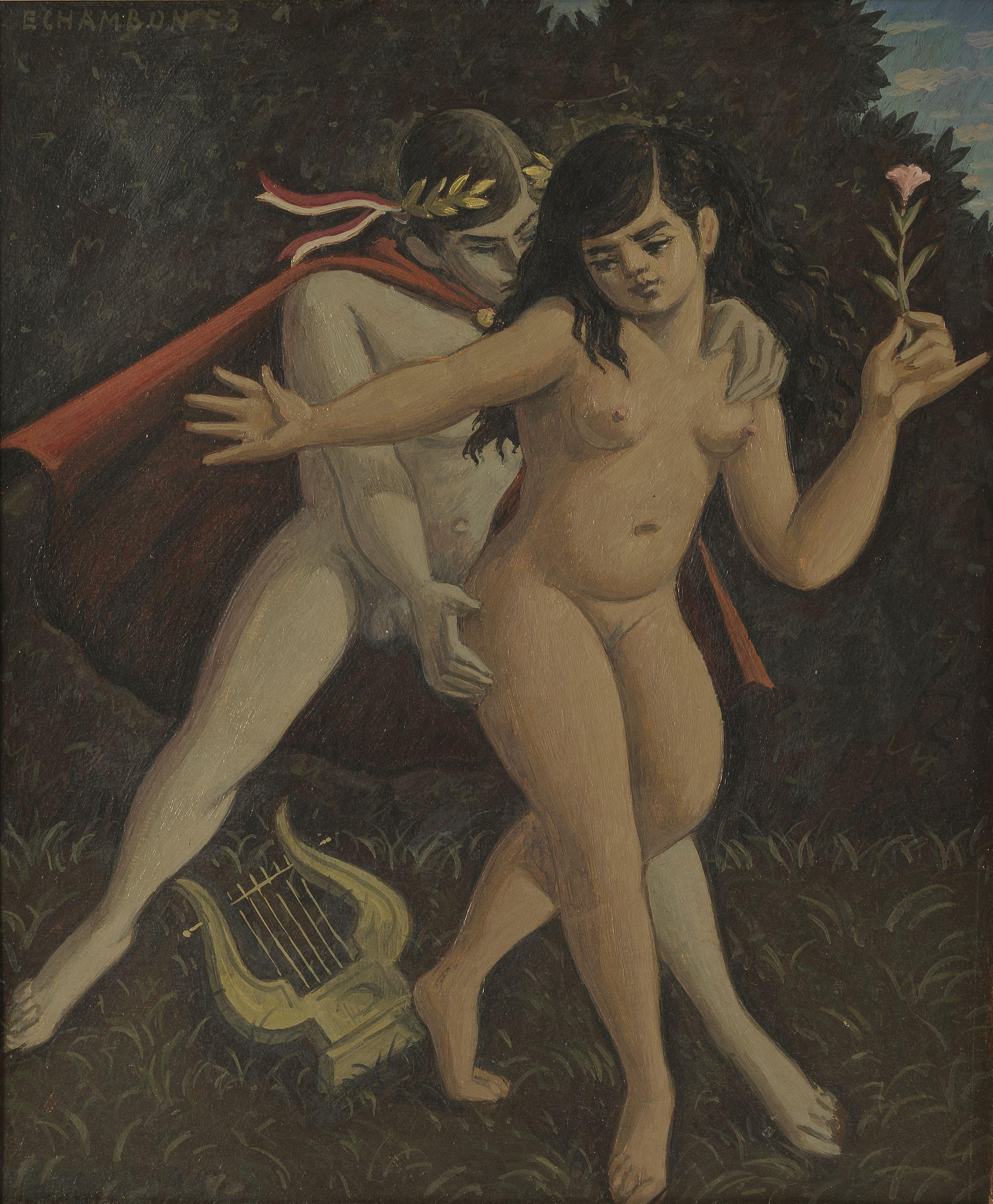 Apollon et Daphné, huile sur carton, signée et datée 53, 46x38 cm,