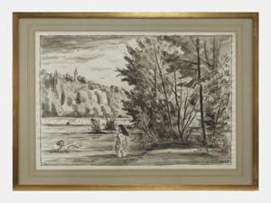 Personnages au bord d'un étang, huile sur panneau, signée, 39x46...