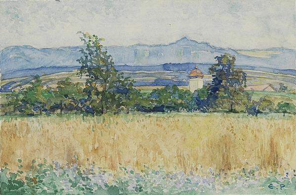 Campagne genevoise, aquarelle sur papier, monogrammée, 9x14 cm