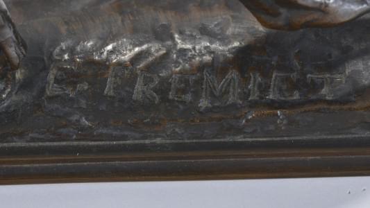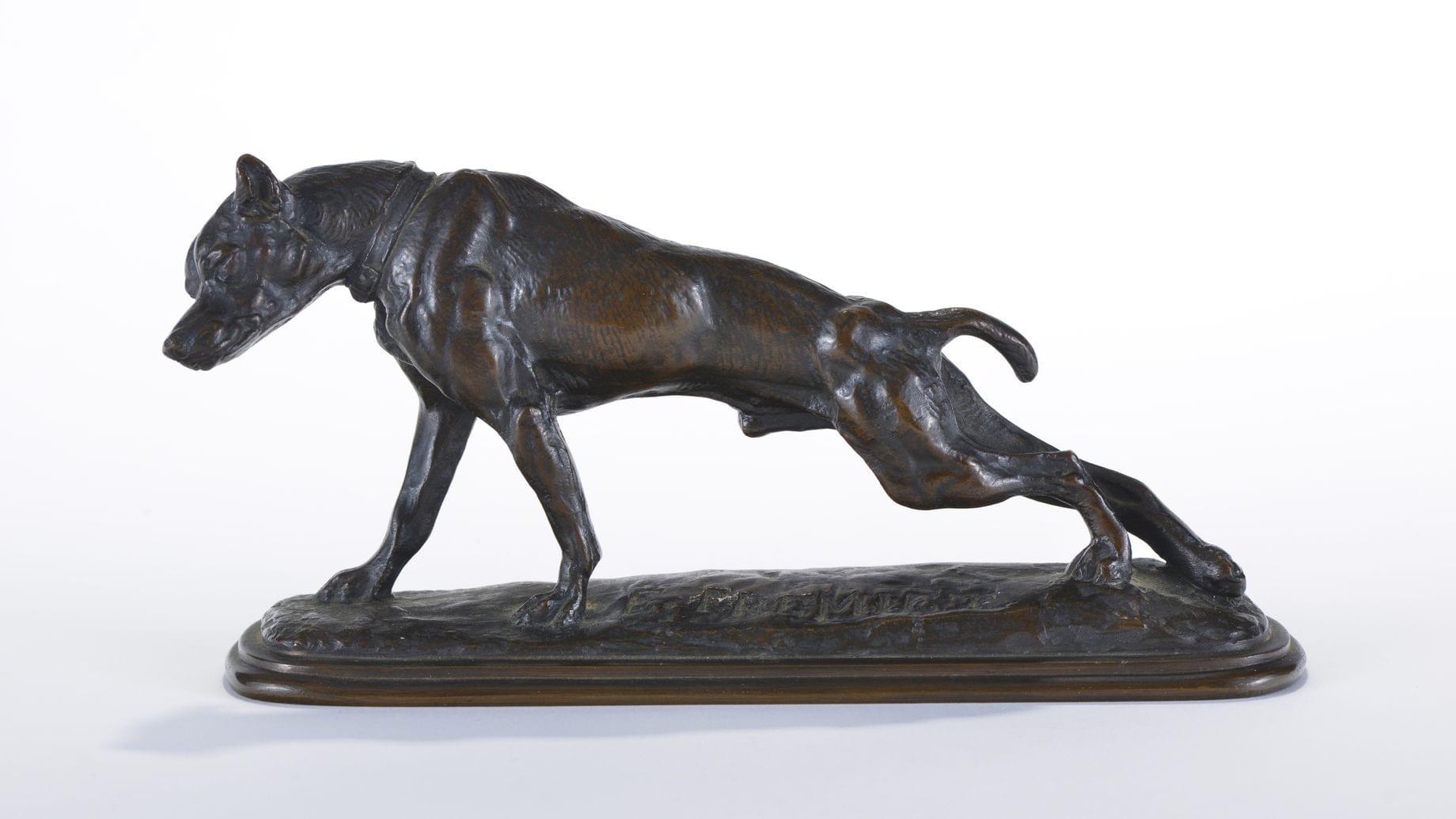 Chien de chasse, bronze à patine brune signé, 10x20x5