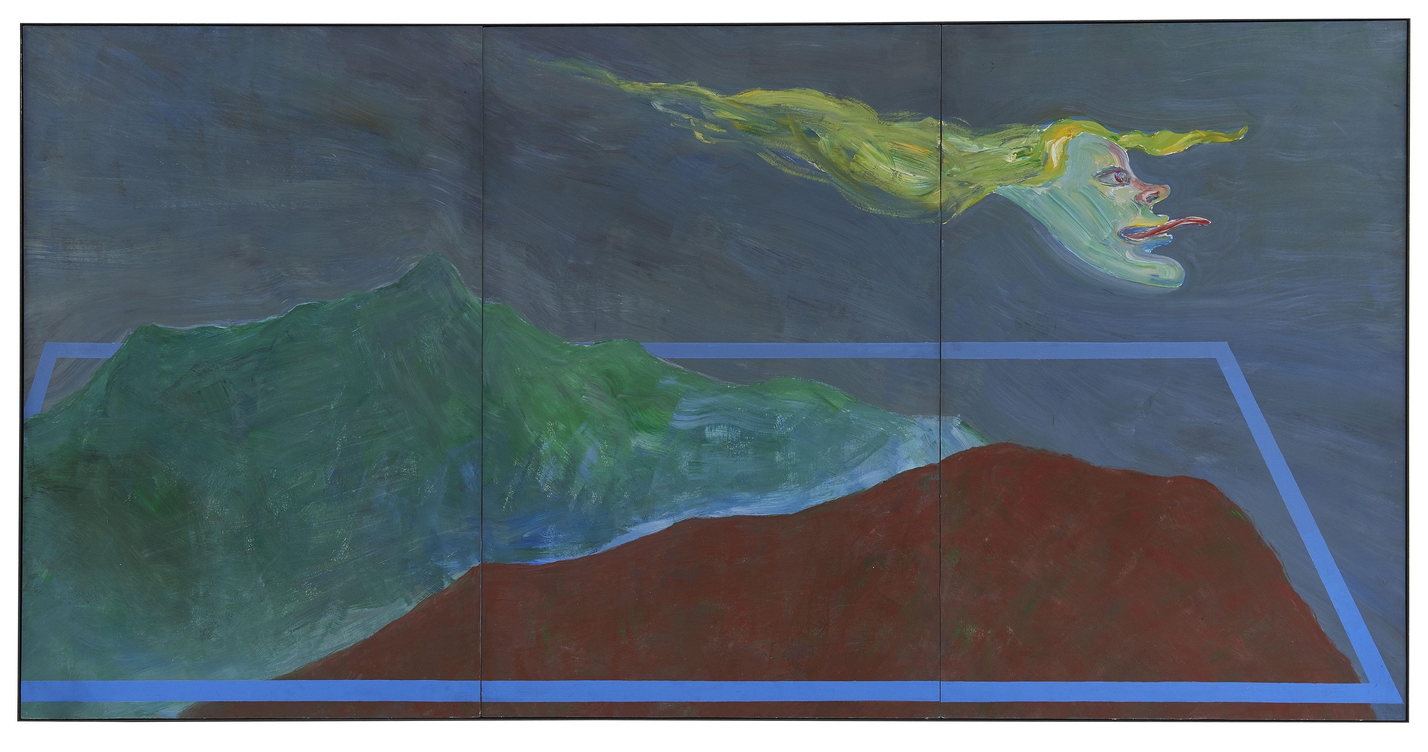 Ange survolant un paysage en ricanant, 1983, acrylique sur papier marouflé sur panneau, tryptique, 120x240 cm