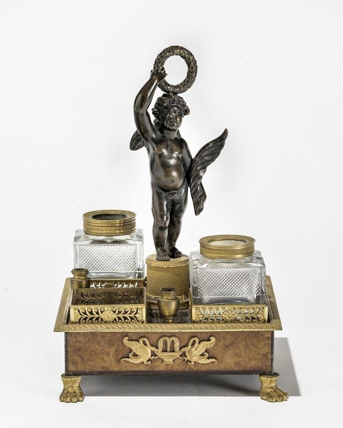 Un amour en ronde bosse au centre, cristal, bronze doré, bronze patiné et placage de loupe, pieds griffes, 25x16x16 cm