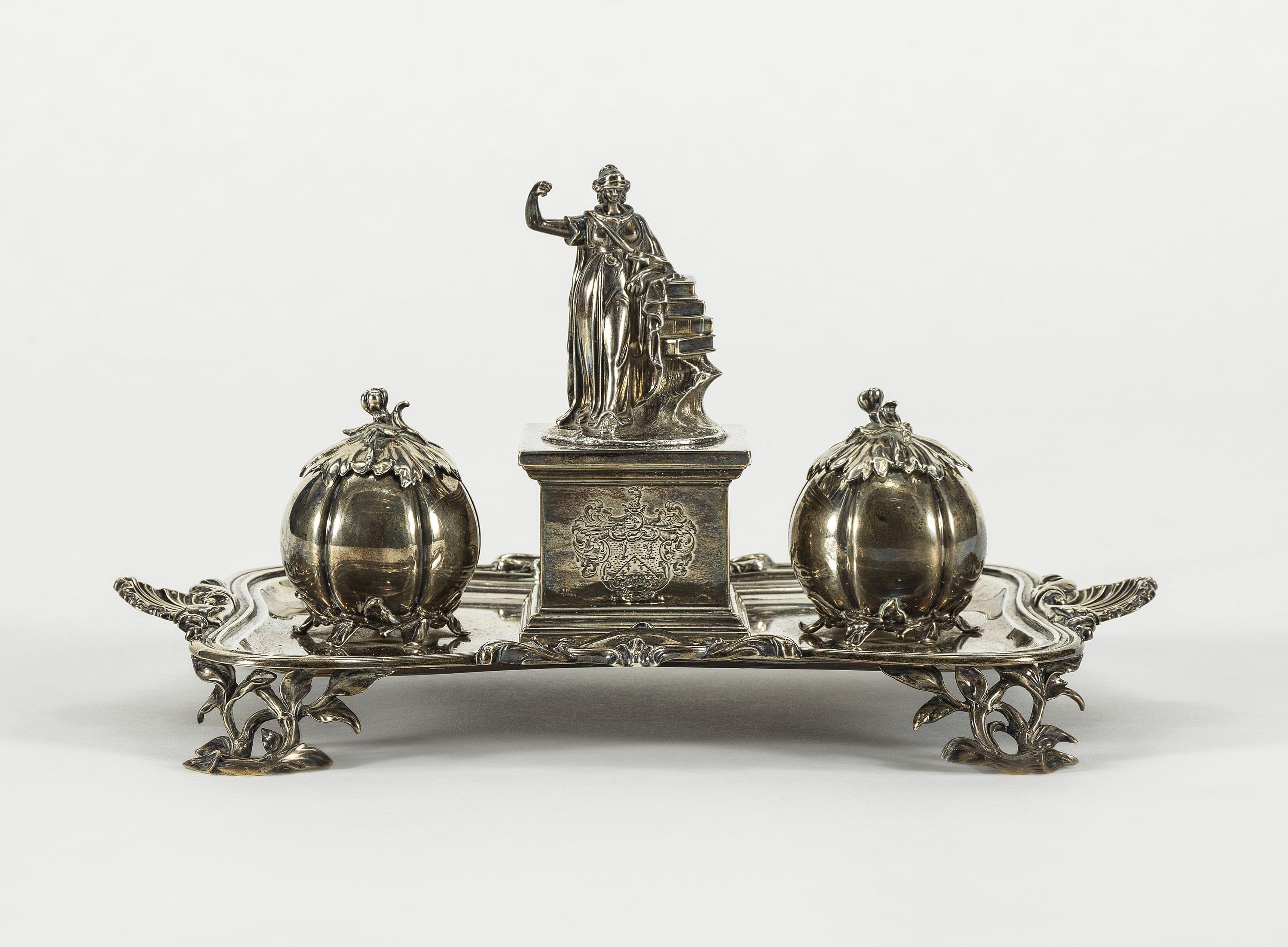 141. Encrier d'époque victorienne à anses coquille, flacons imitant des grenades et motif central d'allégorie de la justice