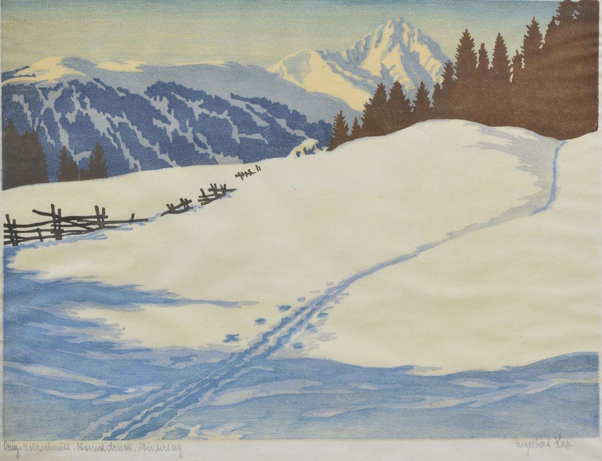 Paysage de neige, estampe en couleur sur papier, titrée et signée, 21x26 cm