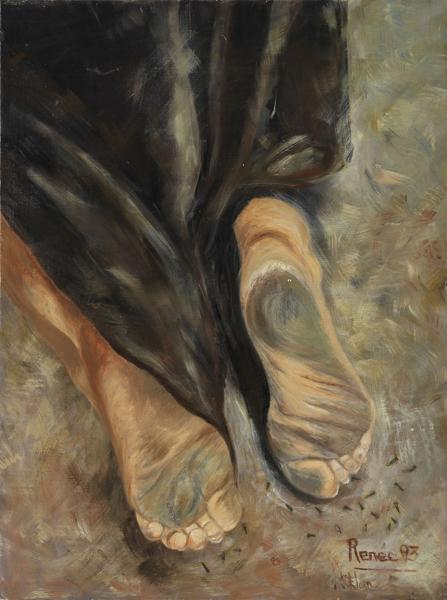 Les pieds, technique mixte sur toile, signée et datée 98, 70x50...