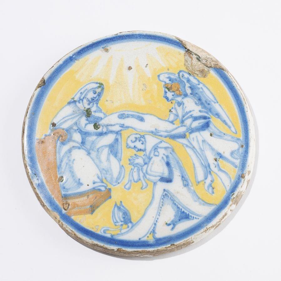 Céramique à décor émaillé d'une scène religieuse, Espagne, XVIIe s, D 22 cm