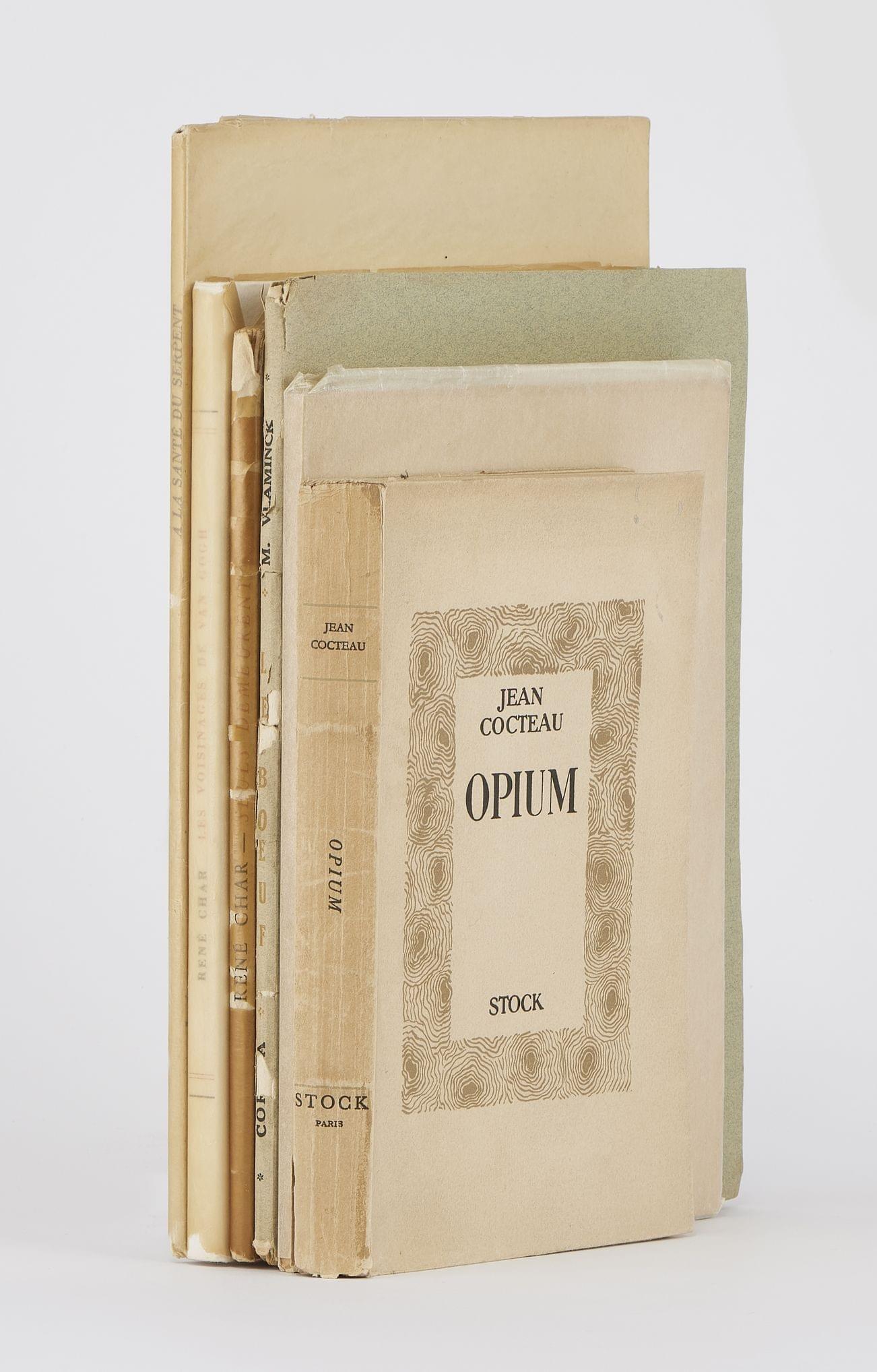- COCTEAU (Jean) : Opium. Paris, Stock, 1948, in 12 broché. Ex. de la première édition, enrichi d’un beau dessin original signé par Cocteau, représentant un buste de jeune homme.
