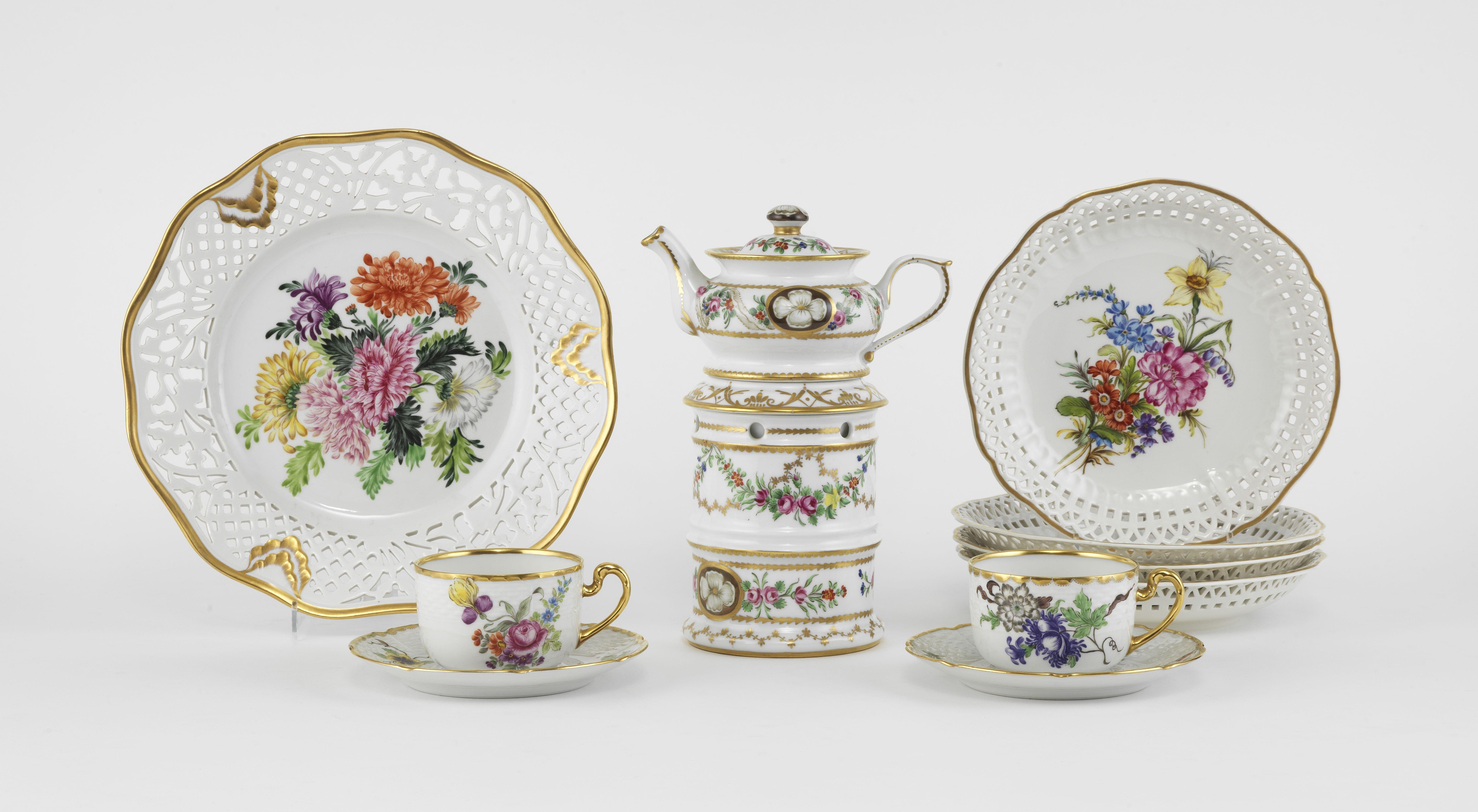 Décor peint à la main par Renée Rapin dans le style du XVIIIe s, porcelaine, comprenant: 1 tisanière, 4 tasses et 5 coupes ajourées (10p)