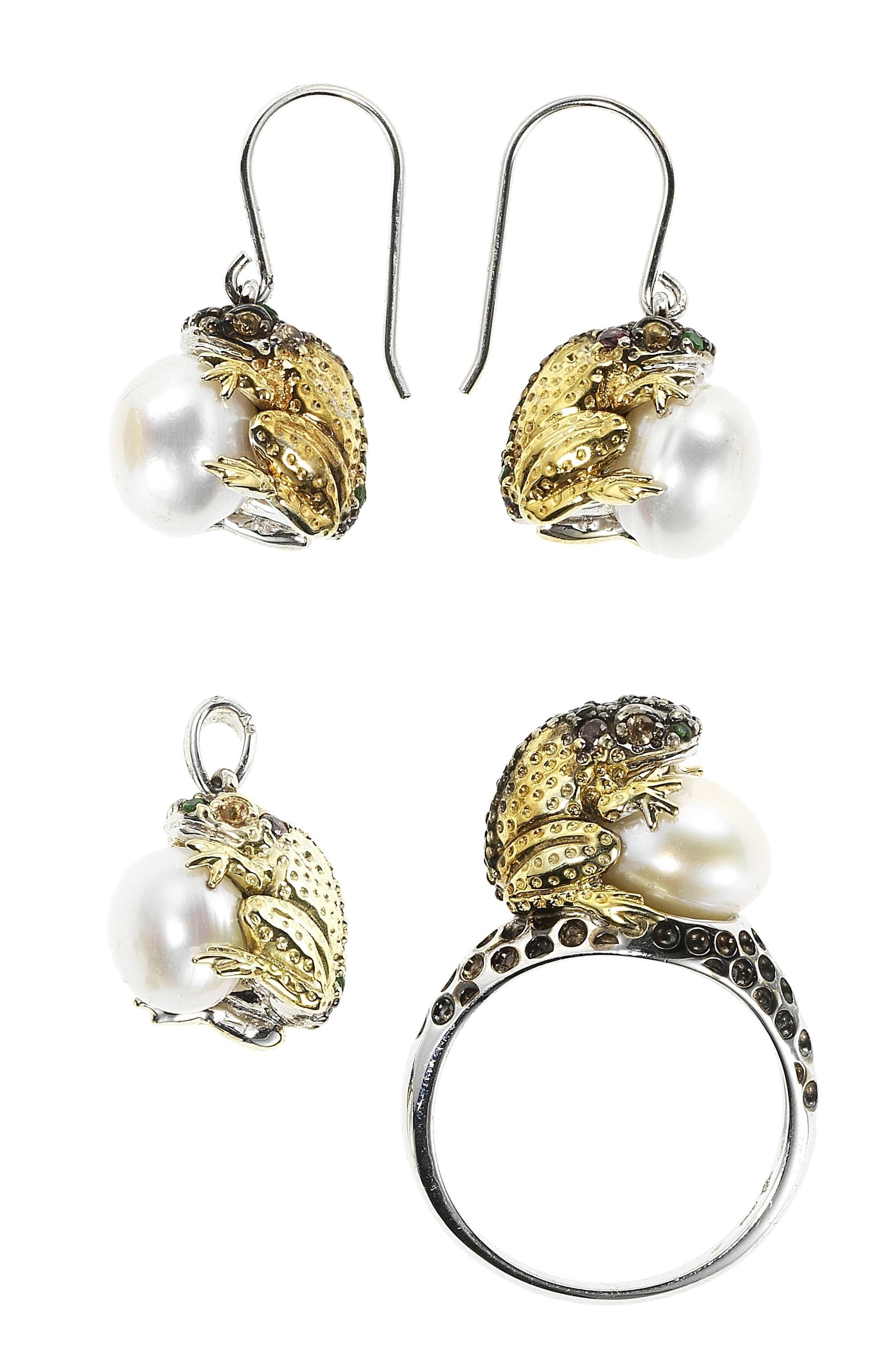 Une bague, des pendants d'oreilles et un pendentif à motif de grenouilles retenant une perle et pavées de saphirs et de tsavorites, argent 925, doigt 59-19, H 2,5 cm. Pour les lots précédés d'un *, la TVA de 7,7% est due sur l'entier du prix d'adjudication.