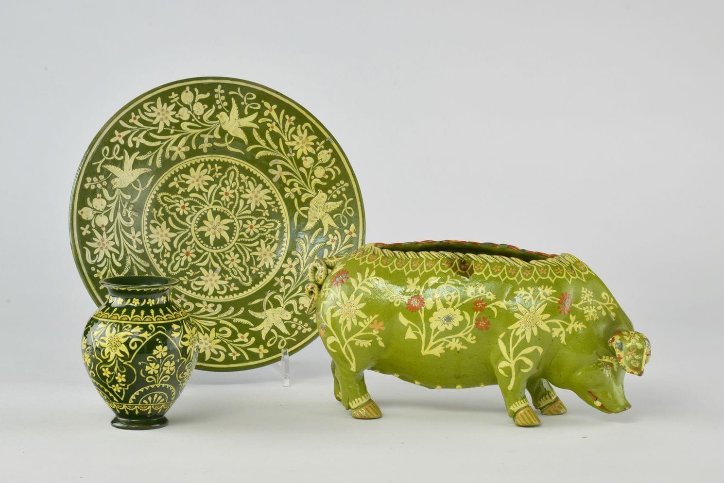 Terre vernissée à décor d'edelweiss, de liserons et de fleurettes stylisées, fond vert, signé "Thun", L 31 cm; un petit vase en terre vernissée, décor d'edelweiss et de guirlandes de fleurettes stylisées, fond vert, signé "Thun Musée céramique", H 12,5 cm; et d'un plat circulaire en terre vernissée, décor central incisé d'une rosace de fleurettes centré d'un edelweiss, large marli orné d'une frise d'hirondelles et de brins de fleurs et d'edelweiss, fond vert, signé "Thoune", D 27,5 cm.