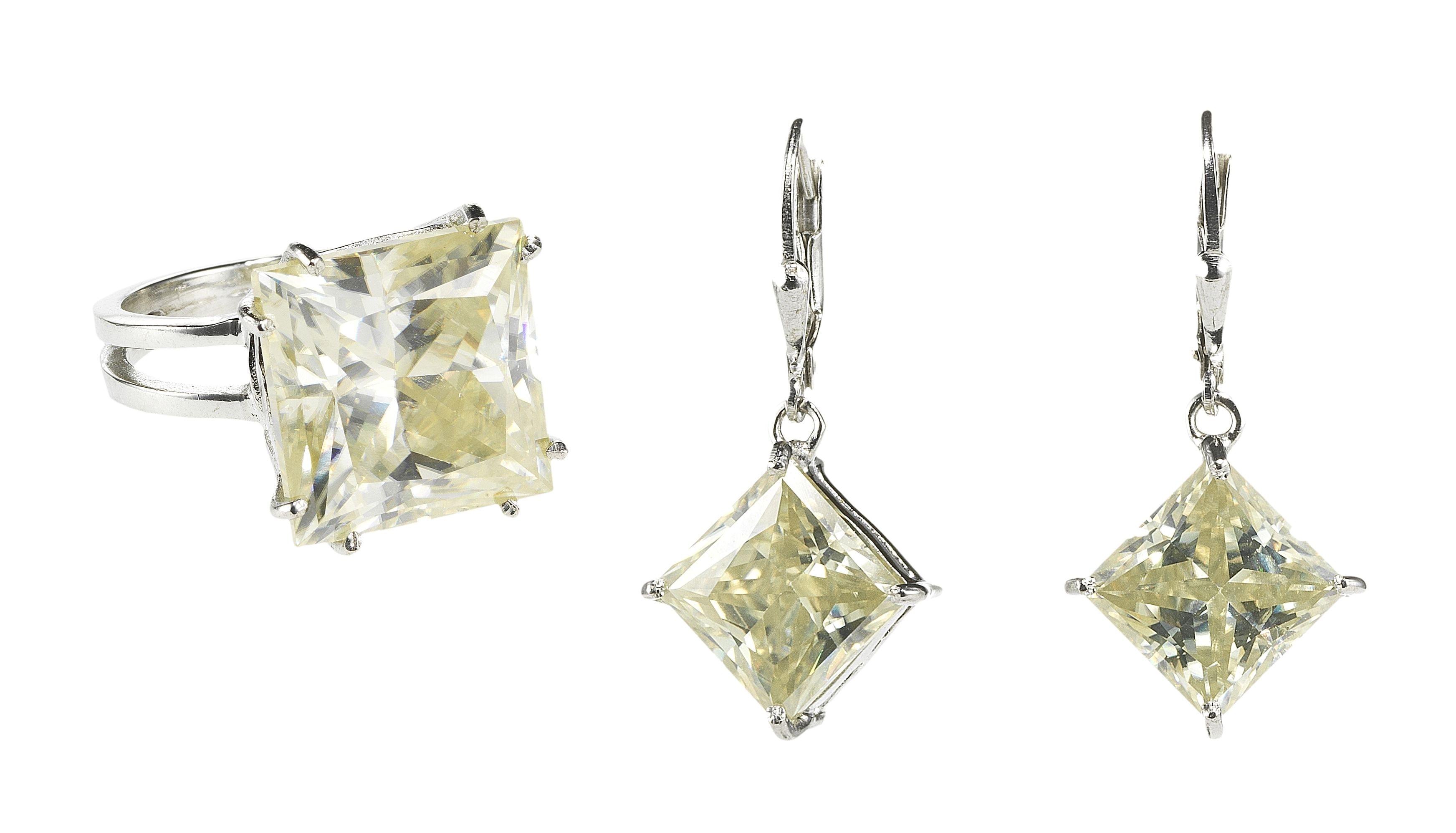 3010. *Ensemble comprenant une bague et des boucles d'oreilles serties de pierres d'imitation pour le diamant